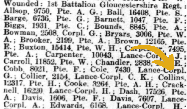 During this time, Eli was injured in action. Within our newspaper collection, we found Eli mentioned in the Gloucester Journal on 30 October 1915. Among many other men, he is listed as wounded.