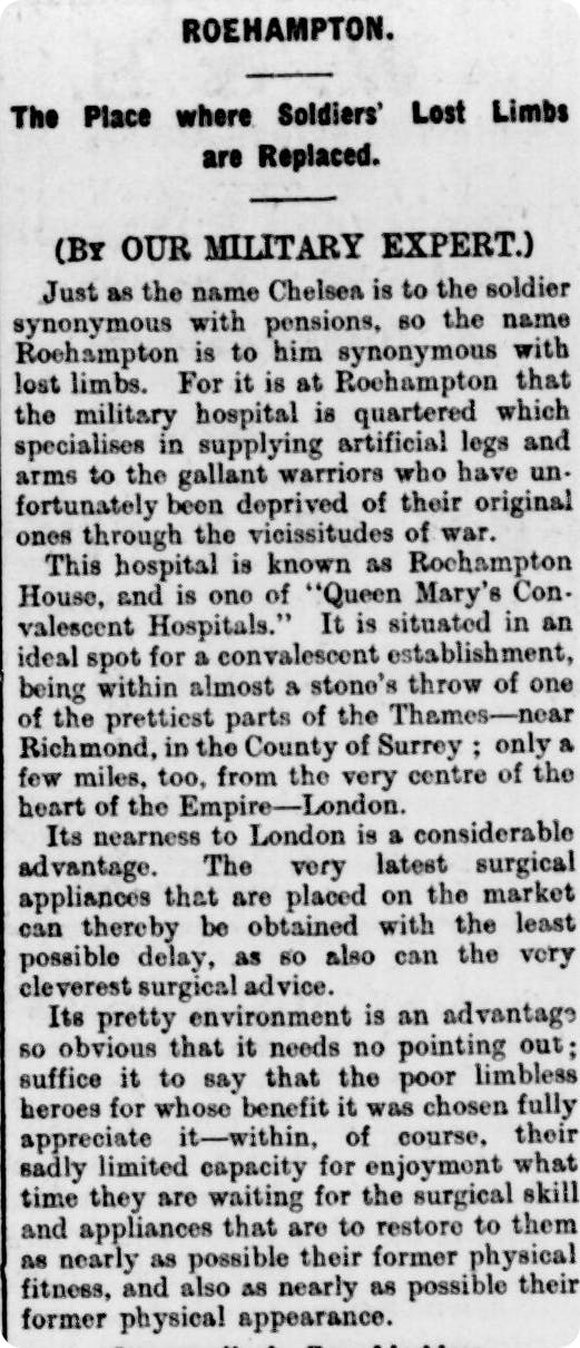 Roehampton's military hospital was described in the Streatham News, 27 October 1916.