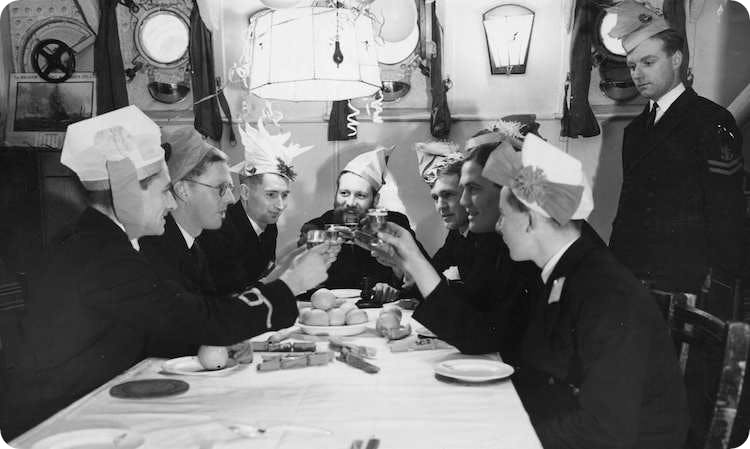 A toast to the King during a Christmas party in the ward room of HMS Westminster, 14 December 1941. Findmypast Photo Collection.