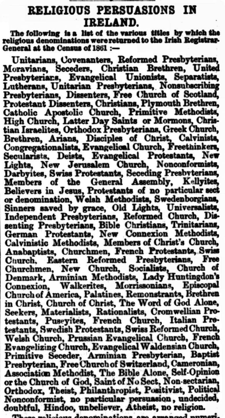 Religious denominations in the 1861 Irish Census, reported on by the Norwood News, 1868. View this page.