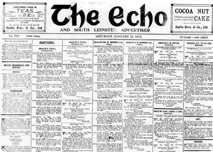- Enniscorthy Echo and South Leinster Advertiser, 1905-1906, 1910-1912, 1916