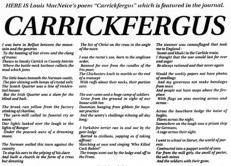 The poem 'Carrickfergus' by Louis MacNeice, published in the Carrick Times and East Antrim Times, 2 December 1993.
