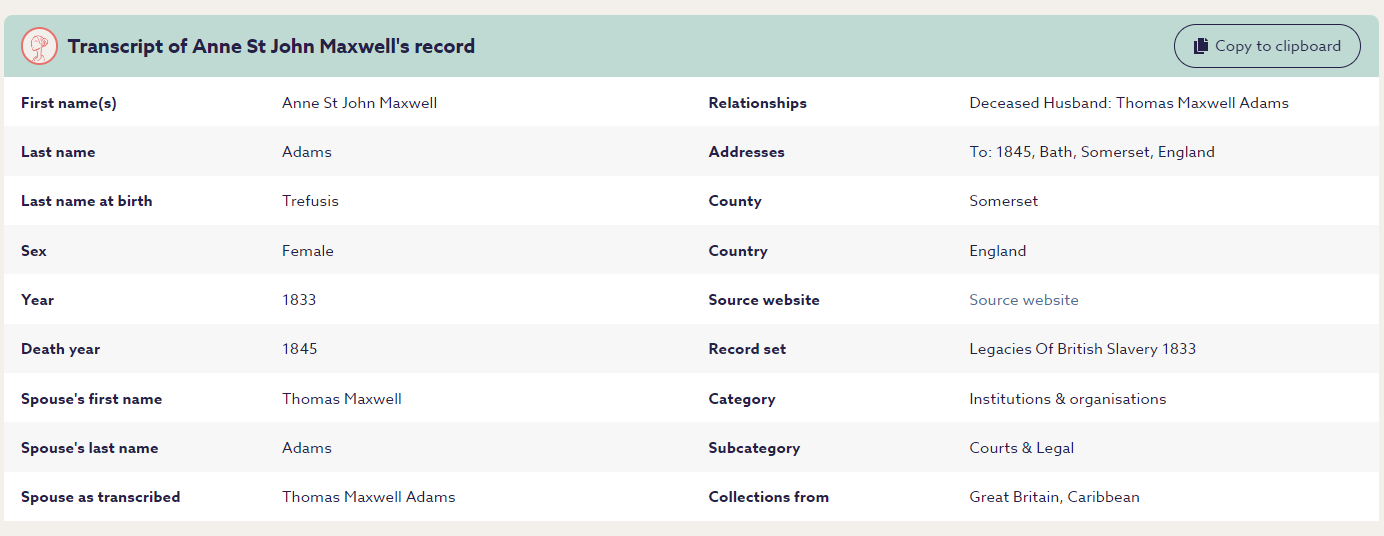 There is also a link to the UCL source website, which will offer a short biography of the beneficiary, as well as the details for the claim to compensation made and information on their estate including the location, the output of goods and the number of enslaved people.