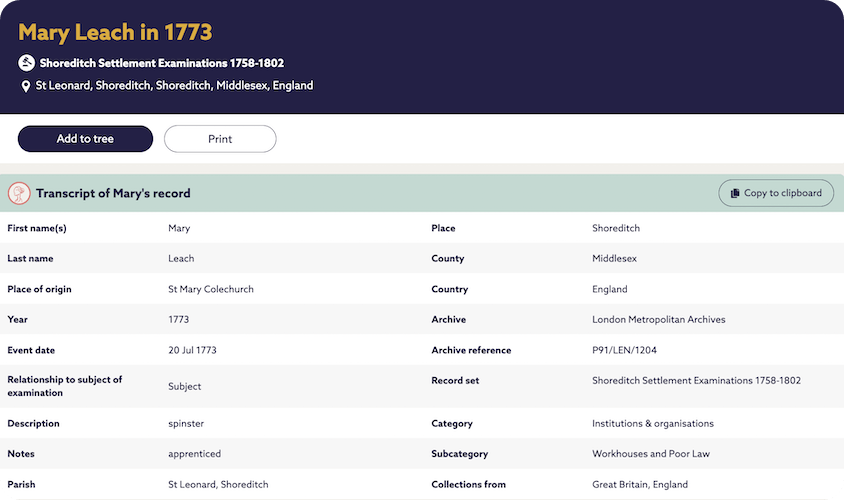 The records kept from this process vary across parishes, but the urban parish of Shoreditch (which was outside of the City of London at this time) has a series of well-preserved records. These are useful as they provide insight into people's lives far before the first English census that included names, which came in 1841.