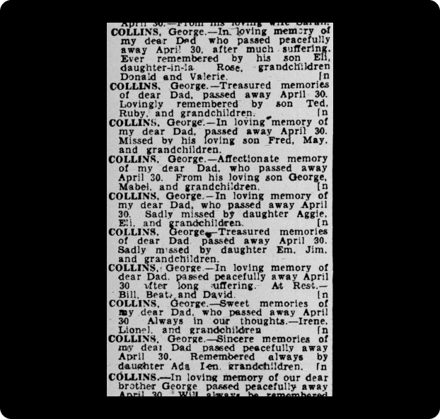 Search death noticesarrow_forwardFind your family's colourful history in black and white